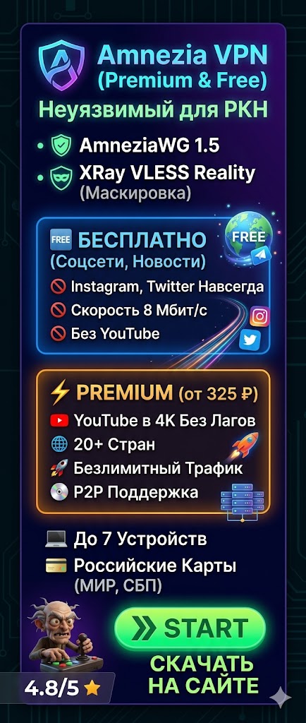 | Amnezia (Self-hosted) | Свой сервер (VPS) | Сложно | Зависит от хостинга | ✅ Да (софт бесплатный, оплата только за VPS) |