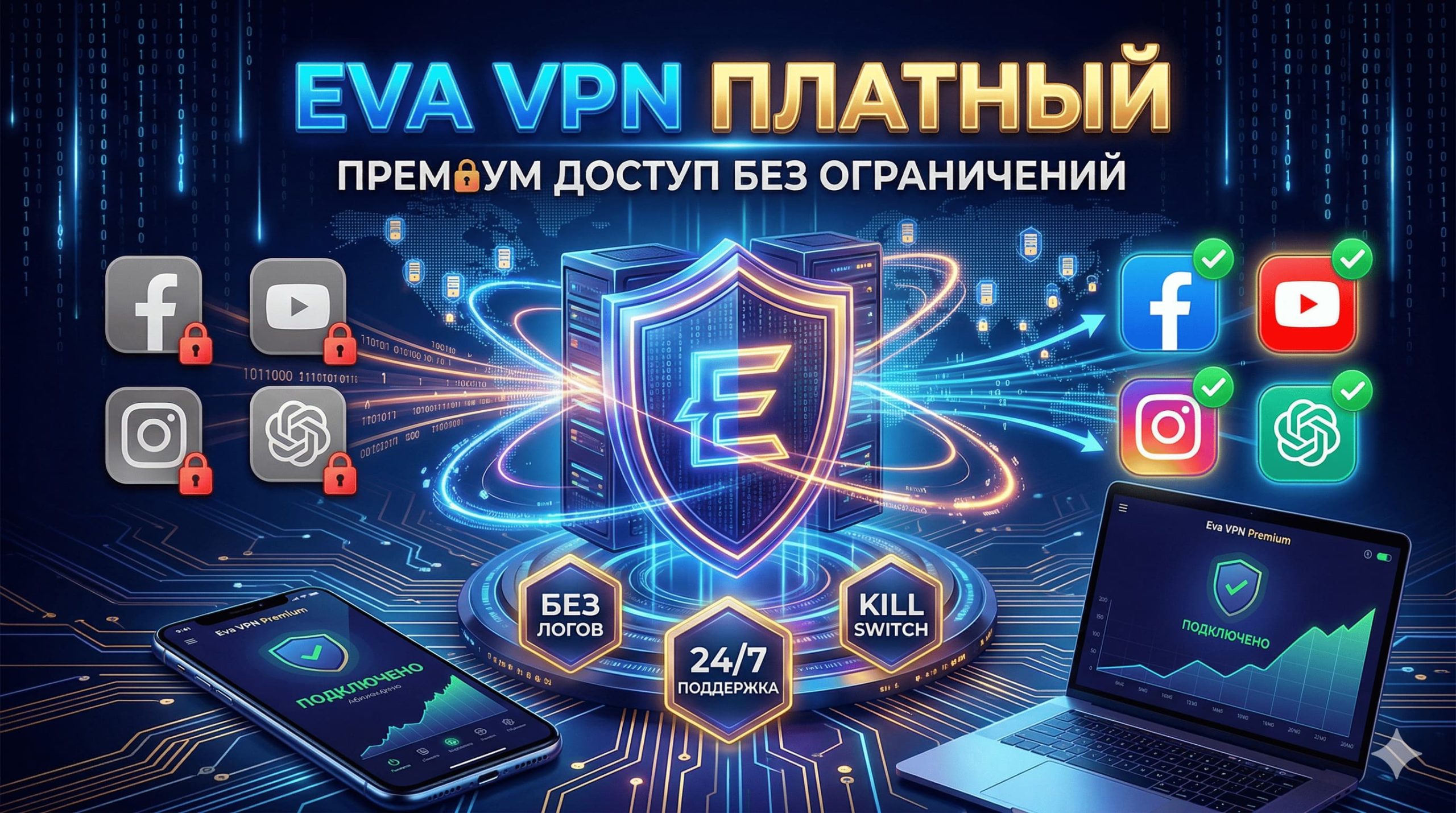 Eva VPN — это профессиональный премиум-сервис, который шифрует весь ваш интернет-трафик по протоколу военного стандарта и скрывает реальный IP-адрес. В отличие от бесплатных сервисов, которые часто живут за счет продажи данных пользователей рекламодателям, Eva VPN придерживается строгой политики «No-Logs» (отсутствие журналов активности).